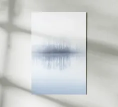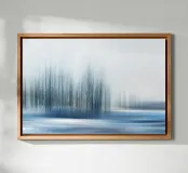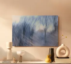 Delicate, abstract winter landscape with bare trees blurring into cool shades of blue and white. The gentle motion blur lends the motif a calm, almost dreamlike atmosphere and emphasises the quiet beauty of winter.