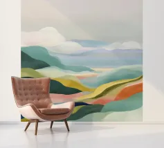 A scenic view of rolling patchwork fields rendered in bold pastels, creating a dreamlike landscape.