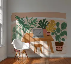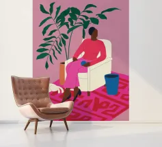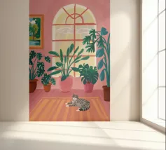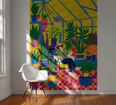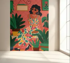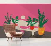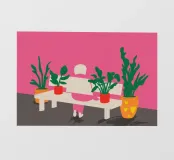 Two figures sit together on a bench in a cozy space filled with an abundance of potted plants and cacti against a bright pink wall. The scene captures a peaceful moment of connection within a personal urban garden.