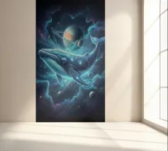 Whales, rays, sharks, and sea turtles glide through the expanse of space, forming surreal and potent visuals. The graceful integration of nature into digital art expands our horizons and frees our spirits. These designs fulfill our yearning for nature and the immensity of being. My illustrations, characterized by a distinctive style where fauna and humanity, oceans and cosmos converge, offer a sense of liberty and the exhilaration of life.