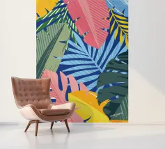 A sophisticated composition combines blocks of tropical leaf patterns with solid color fields and geometric shapes. The patchwork design in shades of blue, pink, and green creates a balanced and stylish piece that is both modern and natural.