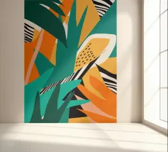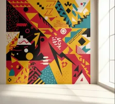A dynamic and vibrant collage of different abstract patterns and textures, featuring stripes, speckles, and solid color blocks in a rich palette, creating an energetic and modern artwork.