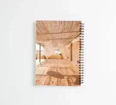Light and shadow play beautifully under a rustic woven canopy, with soft linen swaying gently in the breeze. A tranquil moment of elegance and simplicity.