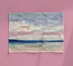 A minimal abstract landscape of soft cloud forms and subtle reflection in muted, neutral tones.