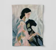 This artwork captures a person in a black dress striking a poised pose beside a leopard. The scene exudes sophistication, confidence, and timeless artistry.