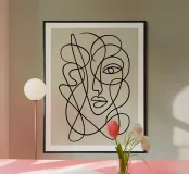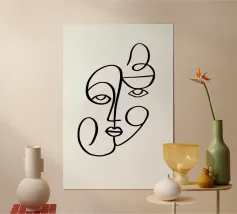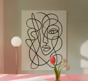A minimalist face drawing is created using a single continuous line. The intricate curves suggest human features on a neutral background.