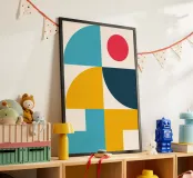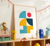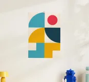 A stunning abstract poster featuring a modular arrangement of pure geometric shapes, executed in a clean and cheerful palette of turquoise/light blue, mustard yellow, deep navy blue, and a vibrant red circle. The composition is divided into sections with large semi-circles and L-shaped blocks, creating a dynamic visual flow. A bold red circle in the top right quadrant acts as a focal point. This artwork is a prime example of the Bauhaus and Mid-Century Modern aesthetic, focusing on clean lines and color blocking. This high-resolution digital download (7000x5000 pixels, 300 dpi) ensures superio