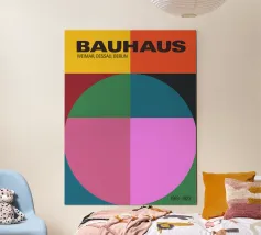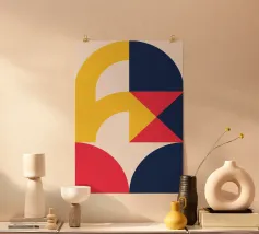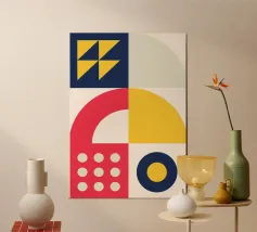 Inject vibrant energy into your space with this captivating abstract geometric art print. The design features a dynamic composition of bold color blocks and circles, creating a playful yet sophisticated visual. A large quadrant shape, split into yellow, red, blue, and hot pink, frames a central circular motif that mirrors these hues in its own divisions. This piece exudes a cheerful, contemporary vibe, perfect for adding a modern pop to any room. Produced at an impressive 7000x5000 pixels resolution and 300 dpi, this high-quality digital art ensures every crisp line and vivid color is rendered