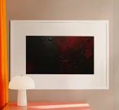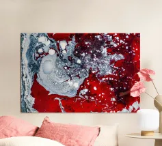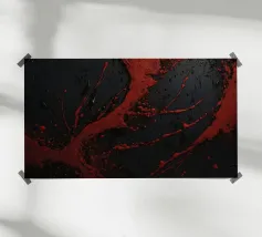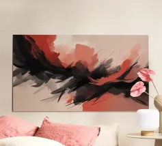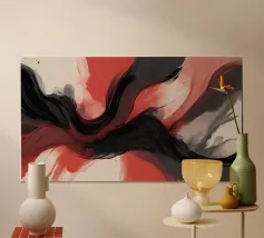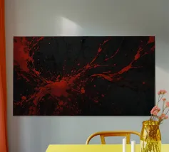 Bold black and red paint splashes cover a dark surface, creating an abstract design. The contrasting colors emphasize texture and depth, enhancing artistic expression.