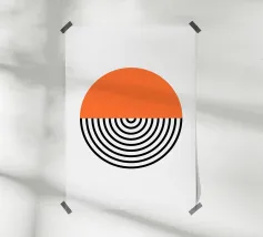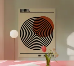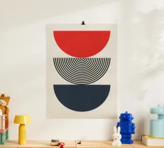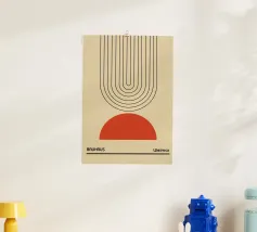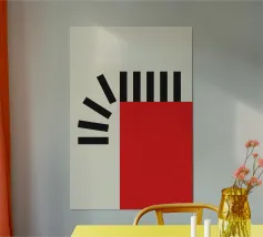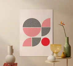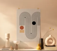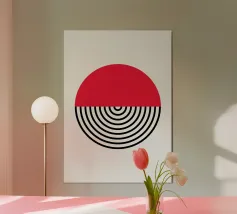 Step into a fusion of retro and modernist aesthetics with this striking abstract art print. The design features a bold red semicircle juxtaposed with a complex arrangement of black concentric arches and parallel lines, creating a visually compelling and dynamic composition reminiscent of 70s graphic design. This piece embodies both a playful retro charm and a clean, contemporary feel. Produced at an impressive 7000x5000 pixels resolution and 300 dpi, this high-quality digital art ensures every crisp line and vibrant hue is rendered with exceptional precision, making it a compelling addition to