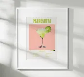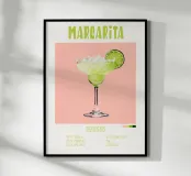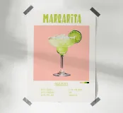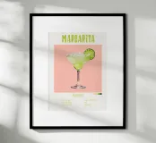 Vintage illustration of the Margarita cocktail recipe on a pastel pink background, with a margarita glass frosted with salt, filled with crushed ice and topped with a slice of lime. A fresh, colourful decorative poster that brings a seaside bar atmosphere to the kitchen, living room or above a cocktail bar.