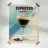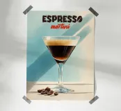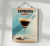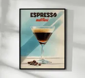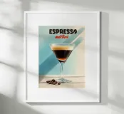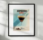 A sleek espresso martini in a tall, angular coupe glass, filled with rich dark coffee and topped with a velvety crema, set against a soft aqua watercolor backdrop with scattered coffee beans on the table. This elegant cocktail print brings cozy café-bar vibes and a hint of late-night glamour to any kitchen, dining room or home bar.
