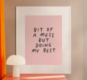Celebrate imperfection with this bold typography art print featuring "Bit of a Mess But Doing My Best" in crude black handwritten lettering on a soft pink background. Designed to embrace authenticity, this piece combines playful charm with a message of resilience. Its hand-drawn aesthetic and soothing pastel hues create a striking yet comforting visual, perfect for adding character to offices, living rooms, or bedrooms. A heartfelt gift for birthdays, graduations, or housewarmings, it resonates with anyone navigating life’s chaos with humour and grace.