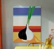 Illustration featuring black and white garlic. Minimalist design and bright colors.
