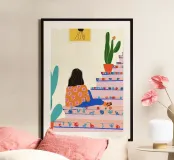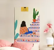 A vibrant and playful illustration in a Folk Art style, capturing a figure seated contemplatively on a brightly decorated indoor staircase. The staircase itself is a piece of Maximalist art, painted in a blush pink hue and adorned with abstract, folk-style red, pink, and blue accents on the risers. The color palette of Orange, Pink, and Cobalt Blue contrasts beautifully with the prominent whimsical cactus in a terracotta pot. The figure wears an eye-catching orange top with abstract florals and bright blue pants, perfectly harmonizing with the Desert Modern/Boho aesthetic. This premium 7000x50