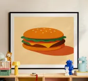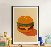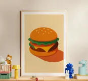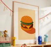 A perfect burger, simple, delicious and curvaceous. This poster pays tribute to the icon of fast-food culture in a clean, retro chic style. Ideal for a kitchen, snack bar or vintage interior. Appetising, graphic, a must-have.