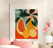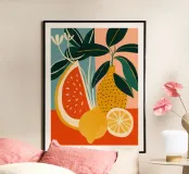 An ode to the beauty of simple things: the work shows a graphic still life with stylised citrus fruits, melon and green leaves, creating a unique balance of geometric rigour and organic softness. The style is reminiscent of the two-dimensional simplicity of Pop Art, the pastel-like backgrounds of the colour worlds of the Post-Impressionists. The texture, which resembles brushstrokes, lends the otherwise clear motif a painterly, handcrafted depth. On the wall, it creates an atmosphere of lightness and adds a sunny note to any room.