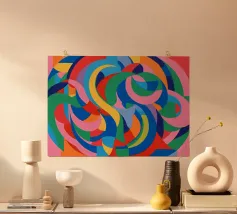 This design showcases an intricate arrangement of flowing lines and vibrant colors, creating a sense of motion and energy. The background is neutral, enhancing the visual impact.