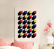 A dynamic and mesmerizing Op Art digital poster inspired by the De Stijl and Bauhaus movements. The design features a grid of alternating black and white triangles creating a strong sense of three-dimensional depth and a checkered shadow pattern. Small squares in bold primary colors—red, blue, and yellow—plus grey, appear to float above the surface, casting distinct shadows. This high-impact visual illusion makes for a modern statement piece. This premium digital download boasts 7000x5000 pixels at 300 dpi, ensuring exceptional clarity and superior print quality.