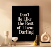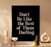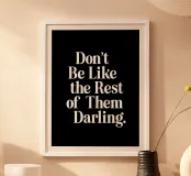 Elevate your space with this striking Coco Chanel typography art print. The iconic phrase "Don't Be Like the Rest of Them Darling" is elegantly rendered in vintage white serif lettering, creating a bold contrast against a solid black background. This timeless design captures Chanel's spirit of individuality and style, perfect for adding a touch of sophistication to any room. Ideal for fashion enthusiasts, empowered individuals, or anyone who appreciates classic elegance with a modern twist. Let this print inspire you to embrace your uniqueness and stand out from the crowd.