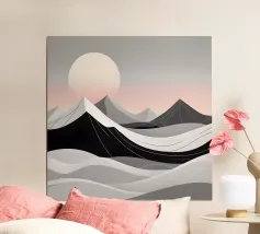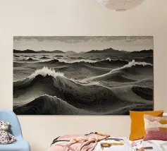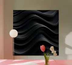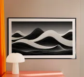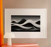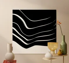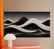 Curved black and white waves undulate across the canvas, forming an abstract landscape. The smooth transitions create a sense of rhythm and depth, inviting contemplation and creativity.
