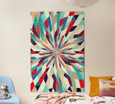 A dynamic arrangement of bright colors radiates outward, forming sharp triangular shapes that converge at a glowing center, perfect for modern digital art and desktop wallpapers.