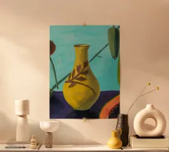 A vibrant still life displays a collection of colorful vases (purple, blue, striped), bowls, and decorative objects artfully arranged on a bright yellow tabletop against a pink and green segmented wall.