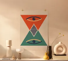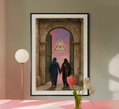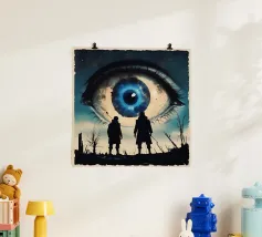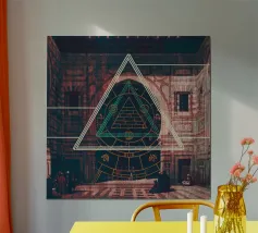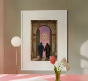 This surreal artwork portrays two robed figures walking hand-in-hand through an ancient stone archway toward a glowing sky of pink and violet hues. Above them floats a radiant geometric eye, symbolizing awareness, mystery, and deeper understanding. The blend of historic architecture, soft sunset colors, and symbolic iconography creates a scene filled with meaning and imagination. Ideal for fans of spiritual art, surreal storytelling, and thought-provoking wall décor that inspires curiosity and reflection.