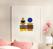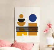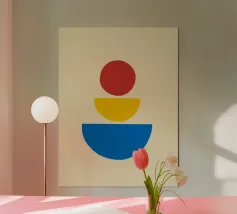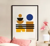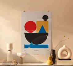 Explore dynamic geometric abstraction with this striking Bauhaus-inspired graphic art print. Featuring a captivating abstract composition of geometric shapes including circles, semicircles, and rectangles in bold colors (yellow, black, blue, brown), arranged in a dynamic abstract design. This artwork embodies the principles of modernist design – form, color, and composition, with a contemporary feel influenced by the Bauhaus movement, highlighting the interplay of geometric forms and vibrant colors. This high-quality digital art file boasts a stunning 7000x5000 pixel resolution at 300 dpi, ens