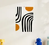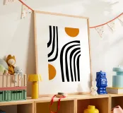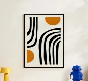 Explore dynamic geometric abstraction with this striking Bauhaus-inspired graphic art print. Featuring a captivating abstract composition of geometric shapes including circles, semicircles, and curved lines in bold colors (yellow, brown, black), arranged in a dynamic abstract design. This artwork embodies the principles of modernist design – form, color, and composition, with a contemporary feel influenced by the Bauhaus movement, highlighting the interplay of geometric forms and vibrant colors. This high-quality digital art file boasts a stunning 7000x5000 pixel resolution at 300 dpi, ensurin