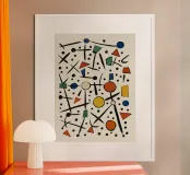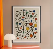 A dynamic abstract arrangement of various shapes in vibrant colors. Lines and circles interplay across the canvas, creating a sense of movement.