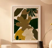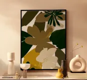 An abstract floral study in rich olive, deep greens, ochre, and soft creams. The interplay of light and shadow with broad, expressive brushstrokes evokes a moody, modern elegance perfect for sophisticated home interiors.