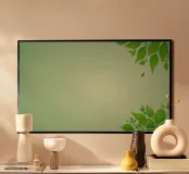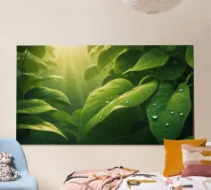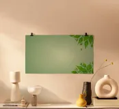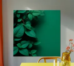 An abstract design features lush green leaves adorning the corners of a gentle background, providing a refreshing and tranquil atmosphere perfect for various digital uses.