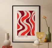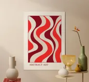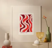 Inject a dose of retro energy into your space with this captivating Abstract Art print. The design features bold, flowing wavy lines in a striking palette of deep burgundy, vibrant coral red, and creamy off-white. The organic, undulating rhythm of the stripes creates a mesmerizing sense of movement, reminiscent of 1970s psychedelic and Op Art aesthetics. This piece is a perfect focal point for a maximalist or Mid-Century Modern interior. Available as a superior digital art file (7000x5000 pixels, 300 dpi), this print guarantees exceptional color fidelity and sharpness for a truly stunning disp