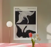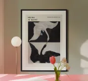 This striking exhibition poster features Hilma af Klint's "The Swan No. 1," a powerful and symbolic abstract work depicting a white swan and a black swan in a mirrored, interlocking composition against a stark black and white background. The piece explores themes of dualism, balance, and interconnectedness, showcasing Klint's pioneering role as a "Pioneer of Abstract Art." The elegant design and profound symbolism make it a captivating piece. This high-quality digital poster (7000x5000 pixels, 300 dpi) beautifully captures the ethereal beauty and groundbreaking artistry of Klint's work, making