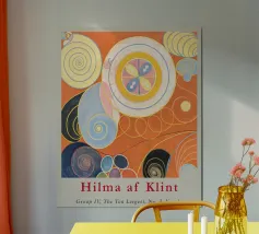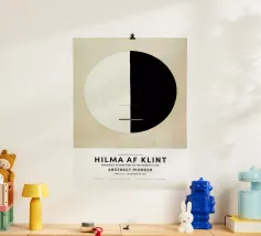 This striking art print features Hilma af Klint's abstract work from "The Swan Series," likely from 1915. The composition is set against a vibrant red background, dominated by two large, curling forms: one transitioning from white to black with an intricate central pattern, and another with a geometric, skeletal structure. This piece embodies themes of transformation, dualism, and spiritual exploration, characteristic of Klint's pioneering abstract art. The bold yet complex design makes it a captivating piece. This high-quality digital poster (7000x5000 pixels, 300 dpi) beautifully captures th