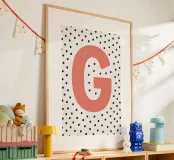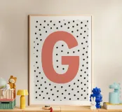 The playful design with the letter "G" in bright red on a black dot pattern is a stylish eye-catcher. Perfect for children's rooms, modern living spaces or as a gift idea with a personal touch. The clear typography combined with a Scandinavian-inspired pattern adds a charming accent to any room. Ideal for combining with other letters from the series.