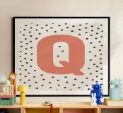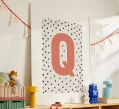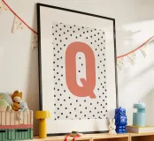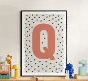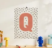 The playful design with the letter "Q" in bright red on a black dot pattern is a stylish eye-catcher. Perfect for children's rooms, modern living spaces or as a gift idea with a personal touch. The clear typography combined with a Scandinavian-inspired pattern adds a charming accent to any room. Ideal for combining with other letters from the series.