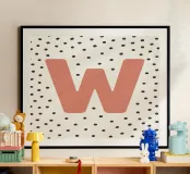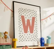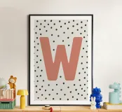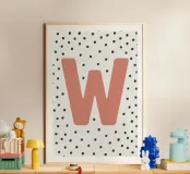 playful design with the letter "W" in bright red on a black dot pattern is a stylish eye-catcher. Perfect for children's rooms, modern living spaces or as a gift idea with a personal touch. The clear typography combined with a Scandinavian-inspired pattern adds a charming accent to any room. Ideal for combining with other letters from the series.