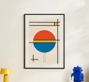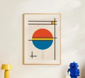 An abstract poster highly inspired by the work of Bauhaus master Wassily Kandinsky, featuring a dominant, segmented circle in primary red (vermillion) and blue, horizontally divided by a thin yellow stripe. The composition is built upon a delicate grid of intersecting thin black lines, with a small yellow square, dashed lines, and a black cross adding minimalist details. This geometric piece beautifully showcases the balance between color, line, and form characteristic of abstract art. This high-quality digital download (7000x5000 pixels, 300 dpi) offers a sharp, museum-grade reproduction.