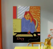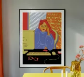A contemporary illustration of a woman with vibrant red hair working at her computer in a dimly lit room. The glow from the screen illuminates her face and blue shirt. The scene captures a moment of focus and late night productivity, with personal items like glasses on the desk.