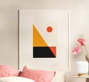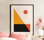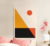 An elegant, minimalist abstract poster utilizing bold color blocking and simple geometric shapes to evoke a sunset landscape. The composition features a large, dominant orange/yellow triangle suggesting a mountain or distant horizon, set against a light background. Below, a contrasting black shape grounds the image, while a small, vibrant burnt orange circle serves as a sun. The design is a beautiful display of balance, form, and striking color contrast, highly inspired by the Bauhaus and De Stijl movements. This high-quality digital download (7000x5000 pixels, 300 dpi) ensures a sharp, modern