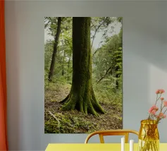 The bark of a large tree is adorned with vibrant green moss, intertwined with twisting branches, reflecting the tranquil ambiance of a forest in the early morning light.