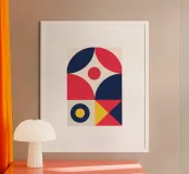 A vibrant abstract poster utilizing a nautical-inspired color palette of deep navy blue, bold red, and bright yellow against an off-white background. The composition is divided into sections featuring clean geometric shapes, including overlapping quadrants, circles, and triangles. The top half presents a central diamond formed by curved, intersecting shapes, with a red circle acting as a focal point. The bottom features a bullseye-like motif and a sharp triangular pattern, creating a balanced and dynamic piece reminiscent of mid-century modern and Bauhaus design. This high-quality digital down