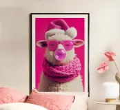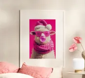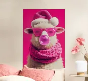 This stylish white sheep with its fluffy curly coat poses confidently against the bright pink background. With oversized pink sunglasses and a cosy knitted scarf (made of sheep's wool, of course) in a matching colour, it effortlessly embodies trendy coolness. The chewing gum bubble adds the finishing touch to the extravagant look. This super-charming sheep combines cuteness with fashionable, cheeky flair - perfect for anyone who wants to add a touch of coolness to their living space. Also available without the Santa hat!