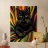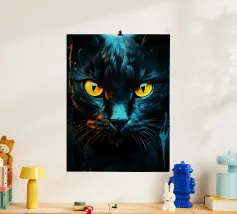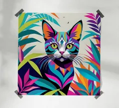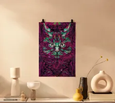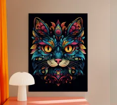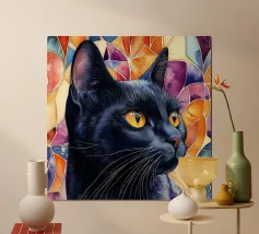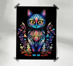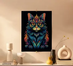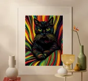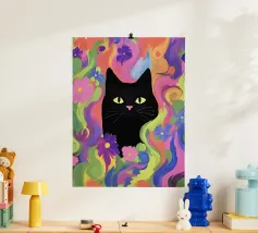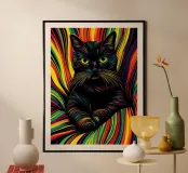 This psychedelic cat fuses 70s aesthetics with contemporary digital art. The black velvet cat is enveloped in a rainbow swirl reminiscent of Op Art and Bridget Riley's kinetic experiments. The hypnotic lines create movement and depth, while the golden eyes act as a still point. A vibrant statement piece for anyone who loves retro charm with modern intensity - pure energy for any room!