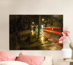 Raindrops cling to a window, creating a blurred view of a city street lit by soft lights in the background. This abstract backdrop captures a serene atmosphere perfect for mobile wallpaper.
