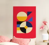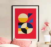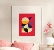 Adorn your walls with this vibrant digital poster, showcasing an intricate geometric abstract design. Set against a striking red background, the artwork features a harmonious arrangement of circles, half-circles, and triangular forms in a sophisticated palette of yellow, deep blue, black, and cream. Inspired by the clean aesthetics of Bauhaus and Mid-Century Modern art, this piece offers a sense of dynamic balance and understated elegance. This premium digital file (7000x5000 pixels, 300 dpi) ensures exceptional clarity and rich color fidelity, perfect for a statement art print.