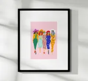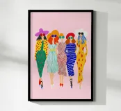 A vibrant and dynamic Pop Art illustration featuring five women confidently posing in a line against a soft pink background. The figures are stylized with an emphasis on curvy silhouettes and dramatic fashion, wearing colorful, pattern-drenched dresses and long-sleeved jumpsuits. The garments are a bold mix of classic abstract patterns, including large yellow and green polka dots and striking wavy stripes in blue, white, and red, reminiscent of 80s and 90s fashion. Topped with wide-brimmed sun hats or berets and bold sunglasses, this artwork is a true Maximalist statement. Delivered as a premi