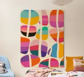 A lively abstract pattern with split stone shapes in bright colours on a cream background: the flowing composition is reminiscent of mid-century modern design with influences from artists such as Matisse and Calder. Horizontal colour gradients in turquoise, orange, pink and violet create a harmonious rhythm, while the curved lines of the split convey natural vertical movement. The cheerful, contemporary style radiates optimism and creativity - ideal for anyone who wants to fill bright rooms with energy and joie de vivre.